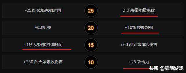 火猫在天赋方面,10级自然点出+25点攻击力,作为物理输出英雄,攻击力全阶段受益。15级天赋,在这有些玩家可能会去选择+60烈火罩的每秒伤害,但小编更推荐去点+1秒炎阳索的持续时间,加强一下控制能力。如果说你更喜欢伤害,也没有问题,因人而异。