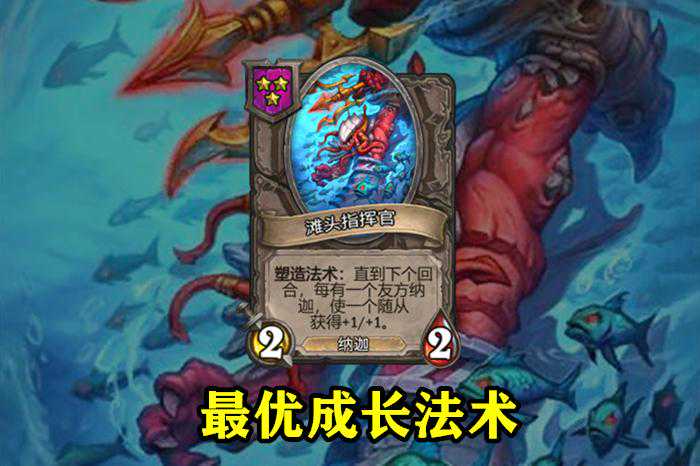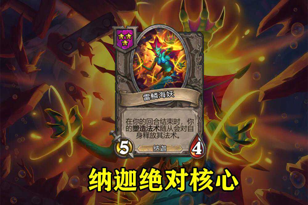 纳迦体系的绝对核心是谁不用多说,雷鳞海妖的被动效果是挂机上分得以实现的关键之一,必须要有。另一个关键则是比较受冷落的纳迦体系五星核心随从小动物管理员,它的被动效果是在你对一个随从施放塑造法术后,使其永久获得+2+2,金色版本为+4+4。它配合雷鳞海妖可以在每回合结束时使我方有塑造法术效果的纳迦稳定获得+2+2,根据镀金情况,最高可获得+8+8。