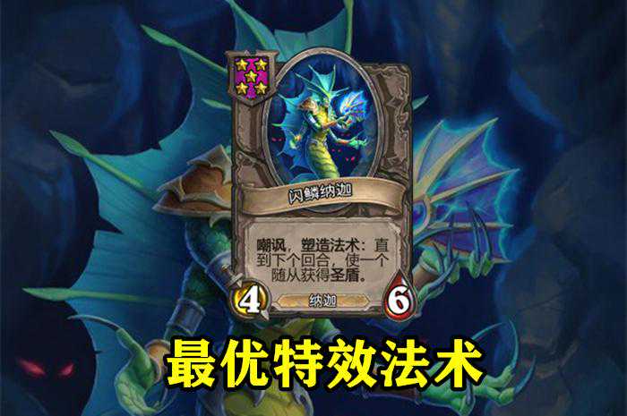 另一个是五星的闪鳞纳迦,最理想的情况是阵容内可以有两个闪鳞纳迦,能镀金也不要镀金。两个闪鳞纳迦配合雷鳞海妖可以在回合结束时固定给自己贴上圣盾,配合小动物管理员不断提供成长,交换能力非常强。同时,两个闪鳞纳迦可以提供两个自由选择的圣盾法术,可以给到其它战斗力较强的随从,比如前面提到的潭头指挥官。这样一来,我们的阵容内就至少有4个圣盾随从,且战斗力都不会低。