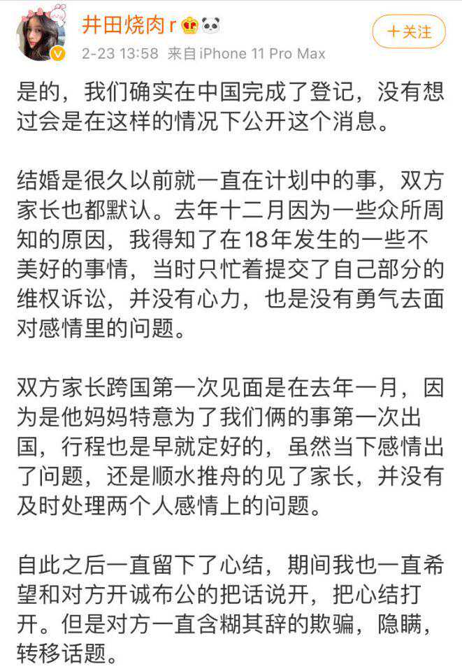imp的“老婆”微博名叫井田烧肉r(以下简称井田),今天,井田在微博发布了一条与imp从登记结婚再到想要离婚的文章,大意就是imp在18年发生了一些不美好的事情(即imp出轨),但因为当时两人正值谈婚论嫁的关键时期,所以井田当时原谅了imp的过错,但这件事一直在她的心里留下了一个打不开的心结。