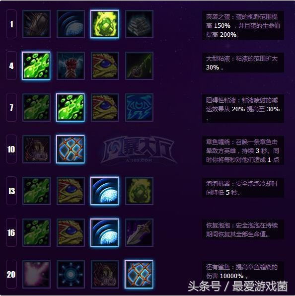 主要就是鱼人冲锋和泡泡鱼,主要的就是偷塔准备,泡泡鱼的清线能力是无可匹敌的,Q和E的骚扰起到一个明显的恶心对方的作用,后期的伤害是非常之高的,只是鱼人冲锋不能对小兵起作用,当然也有其他技能的点法。