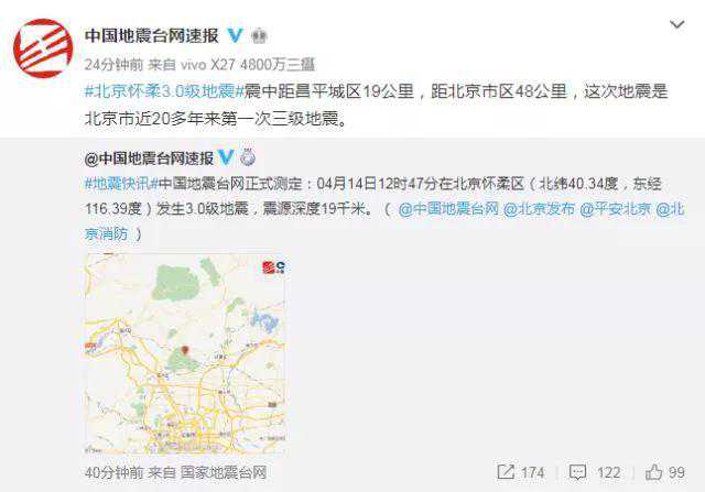 中国地震台网正式测定,4月14日12时47分在北京怀柔区(北纬40.34度,东经116.39度)发生3.0级地震,震源深度19千米。