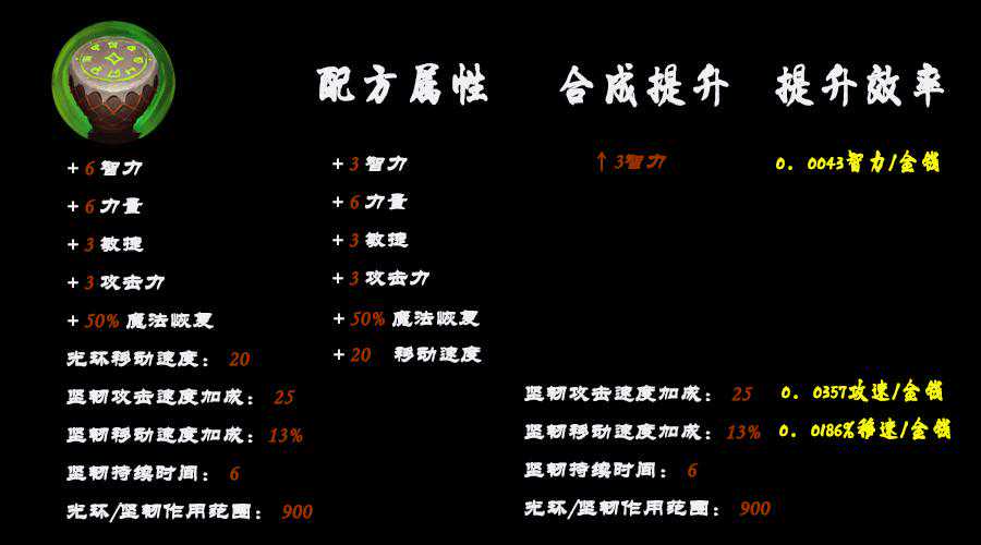 对比韧鼓和支配可以看到,两者属性总和都是12点,韧鼓偏重于力量,韧鼓提供一个价值325金钱的50%魔法恢复,支配提供一个价值1200金钱的生命恢复光环。其他光环效果,支配可以利用招的野怪提供持久的光环,使其作用完全等同于或者超越韧鼓的瞬间光环增益效果。