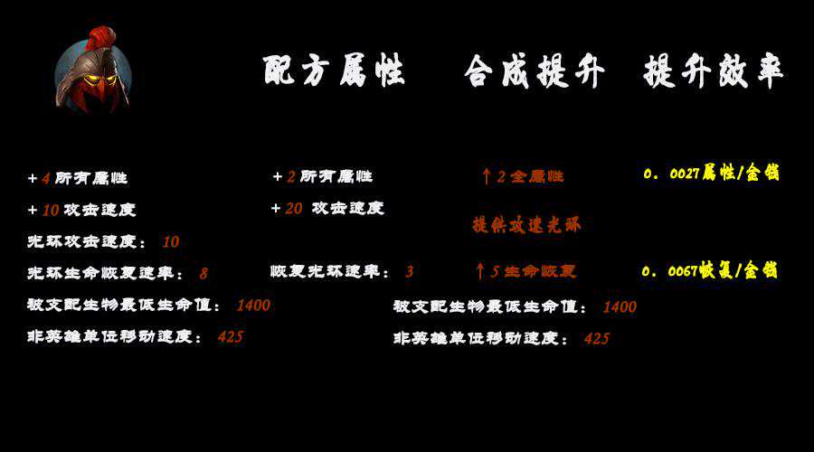 从上图可以看出,750金钱的卷轴稳定提升了2全属性,5生命恢复光环,同时提供了一个移速为425的中立生物,血量1400。那么,圆环125金钱加2全属性,恢复头巾575金钱提供2全属性加3生命恢复光环,这样5生命恢复光环相当于750金钱。这样看来,合成支配,免费赠送一个10攻速光环,一个1400血量、425移速的肉排,肉排还带一个控制技能或者一个AOE技能或者一个光环。