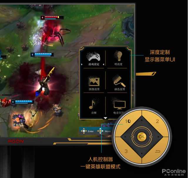 作为一款定制产品,不仅外观要联动,在软件内部层面也要有着对应的优化,所以AOC的研发工程师与RiotGames的视觉设计师进行专业手工调校,为爱攻AG275QXL写入了英雄联盟游戏模式,更有定制化的调节菜单,我们可以通过控制器一键切换至英雄联盟模式,让游戏瞬间进入最佳设置,无需手动调节众多参数与选项。