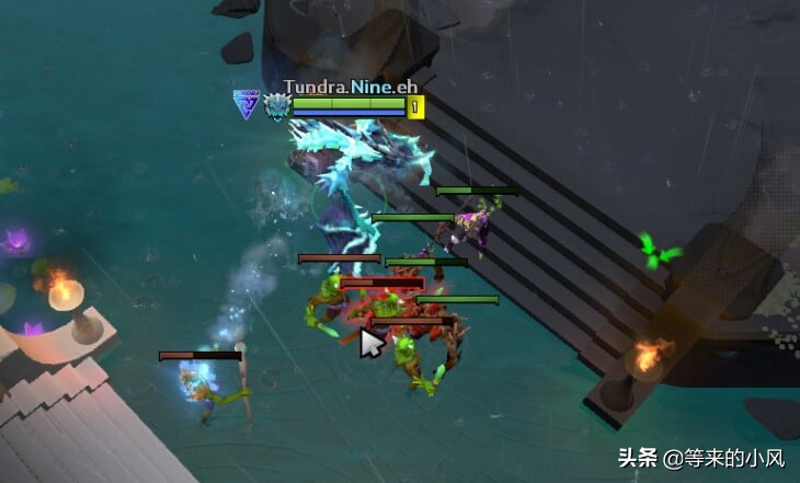 18分40秒,Nine有一次非常细的操作。当时Tundra众人正在围追堵截Ceb的伐木机,但Nine并没有A上去!这不是失误,而是一个精密的计划:当时Ceb有清莲宝珠,可以拿来解掉巫师之刃和严寒烧灼持续伤害的debuff。而Nine耐心地等到队友光法先给他上了炎阳之缚,Ceb用莲花球解掉了这个debuff后,冰龙才开始平A。