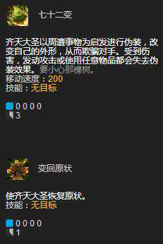 一个彩蛋技能,可以让大圣变身成各种环境物品,神符,树木,信使。实战中并没有很好的运用效果,值得一提的是,大圣出门变成信使可以有更快的移动速度,我经常会变成小鸡,吃完赏金后赶路到兵线上,变成猴型卡兵。另外在上下坡的树林中,没有受到弹道或者技能持续伤害的情况下,找个机会变成树也是不错的选择。