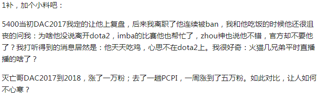不知道大家是否还记得在2017DAC上,5400在最后复盘的精彩表现不用多说,一句口头禅“等待的就只能是灭亡”让刀圈出现了另一股清流。和往常那些,将职业选手使用的技能说一遍,有时候技能名字还没说对的解说身上,看不到像5400这样虽然萌新,但十分刻度愿意用心的人。吃老本是大多数人的习惯,一直进步的5400现在在绝地求生的舞台上继续发挥着光和热。