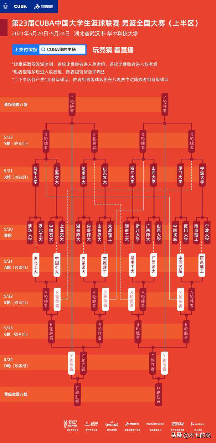 第23届中国大学生篮球联赛全国赛共有32支球队,由四大赛区的前6和附加赛的8支球队组成,将在5月20日-24日决出全国八强,而八强赛在6月上旬开打。与CBA联赛今年季后赛的单败淘汰加系列赛的方式不同,也有别于美国NCAA的64强单败淘汰,CUBA的赛制有点特殊。