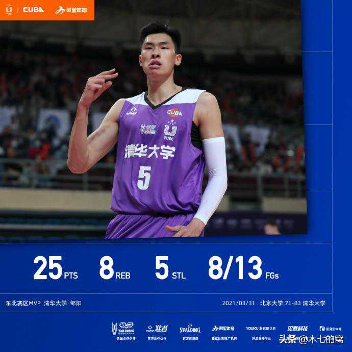 再次交手,清华已占上风,王岚嵚控场,“清华杜兰特”邹阳砍下25分8板5抢断,清华83-71轻松取胜,时隔十年再夺东北王。2011年夺冠的那支东北王核心叫曾令旭,决赛轻松拿下35分,而今,他是CBA联赛里出色的老将。