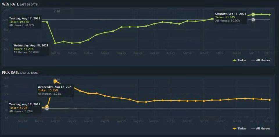在7.30新版本上线之初,许多为了尝鲜的玩家也是玩起了他们好几年都不曾触碰的TK,而这也导致了TK在新版本中的上场率暴涨了近一倍之多,而在上场率暴增的同时,其胜率也是从版本更新前的50%暴跌至45%。但值得一提的是,随着玩家们的新鲜感的褪去,目前TK的胜率已经稳定在了51%左右,而上场率也是较之前的版本有所增加。