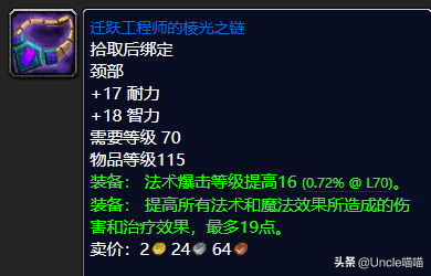 项链方面的话喵叔主要推荐这几款给大家,相对来说的话这几款都是分别属于不同类型的了,第一款加法术命中提高的蛇牙项链,第二款的迁跃工程师的棱光之链加持法术爆击提高,而我们的紫色高级货击碎者的护符的话掉率感人,而且比较适合于打PVP的玩家,所以在前期的话大家可以根据自己的需求来选择最合适自己的就可以了,喵叔个人还是比较喜欢加持法术命中的,毕竟前期命中的优先级喵叔个人还是感觉要高于法术爆击提高的,所以都值得你去拥有,经典项链强势推荐,推荐指数满天星辰直戳天花板,我戳我戳我戳戳!