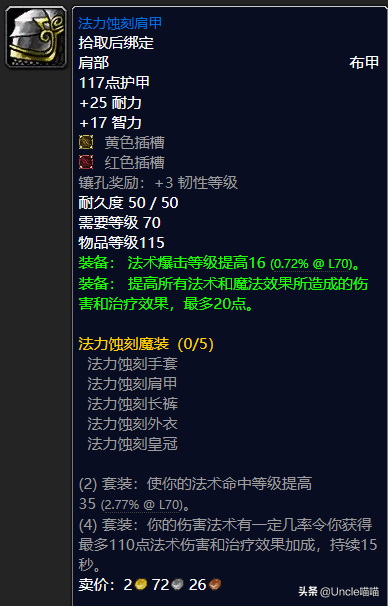 就法力蚀刻肩甲前面已经说过了喵叔这套装备是非常的推荐的,所以5人本之中它可以说是你必须拿下的布甲输出肩膀之一了,而且这款肩膀的话掉率个人感觉还是可以的啊,大家多刷刷就是了。