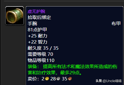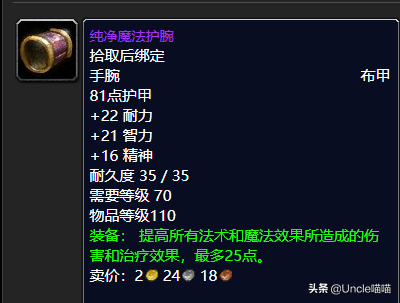 手腕方面的话喵叔就重点推荐这款出自于英雄模式法力陵墓BOSS节点亲王沙法尔的虚无护腕,对于一般的玩家来说就算是卡拉赞不换也没啥毛病的好东西,高法伤高智力都是非常的不错。当然破碎大厅也有一款出自于BOSS酋长卡加斯·刃拳的纯净魔法护腕也还可以。