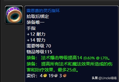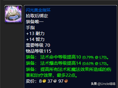 戒指方面的话喵叔个人推荐这两款给大家,当然最好的就是这款出自于英雄模式旧希尔斯布莱德丘陵BOSS时空猎手的闪光奥金指环堪称前期极品了,法术爆击以及法术命中齐聚,而且法伤以及属性都是不错,可谓是戒指中的霸王了,当然这款禁魔监狱的雷恩葛的灵巧指环也是同样可以,高法伤高法术爆击高属性真的不错,推荐指数满天星辰直戳天花板,我戳我戳我戳戳戳!