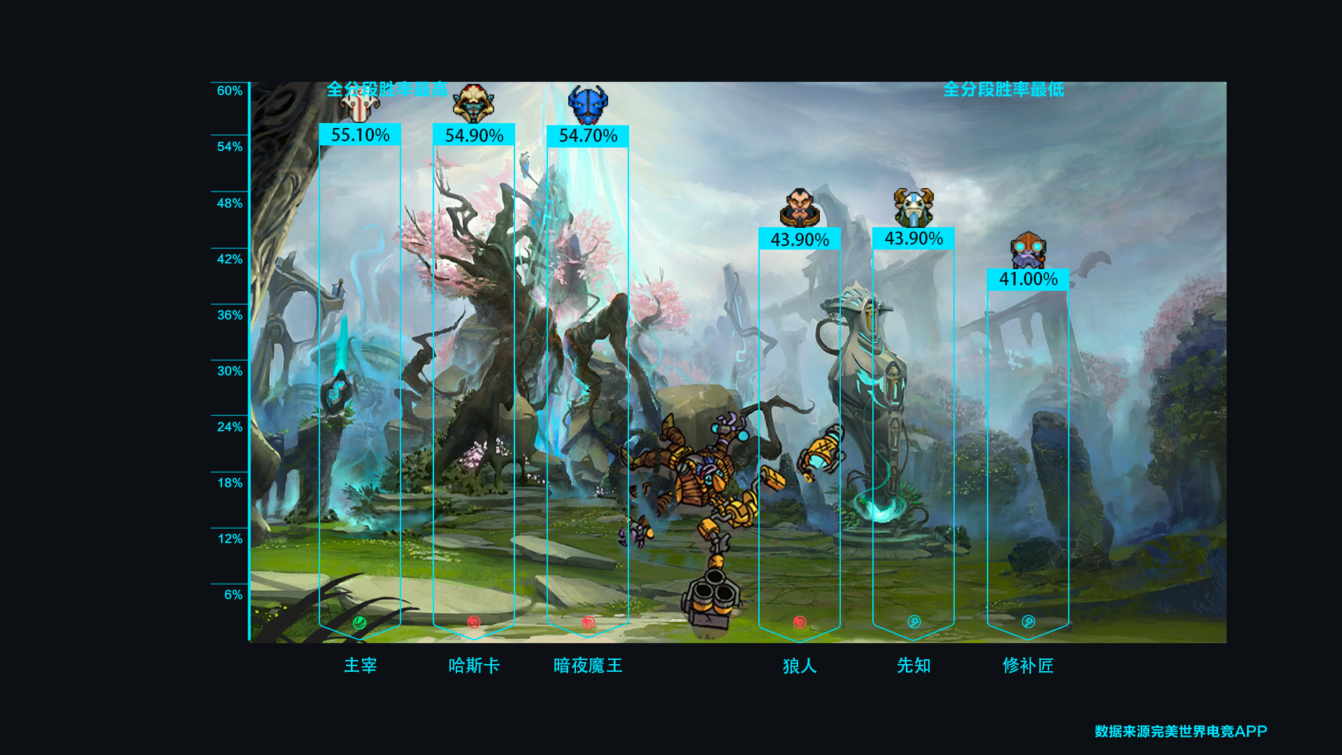本周环境仍然相对平稳,整体上没有特别突出的英雄,只有修补匠依然在全分段明显弱势于其他英雄,不过值得注意的是,主宰悄悄登上了胜率和使用率双榜第一。