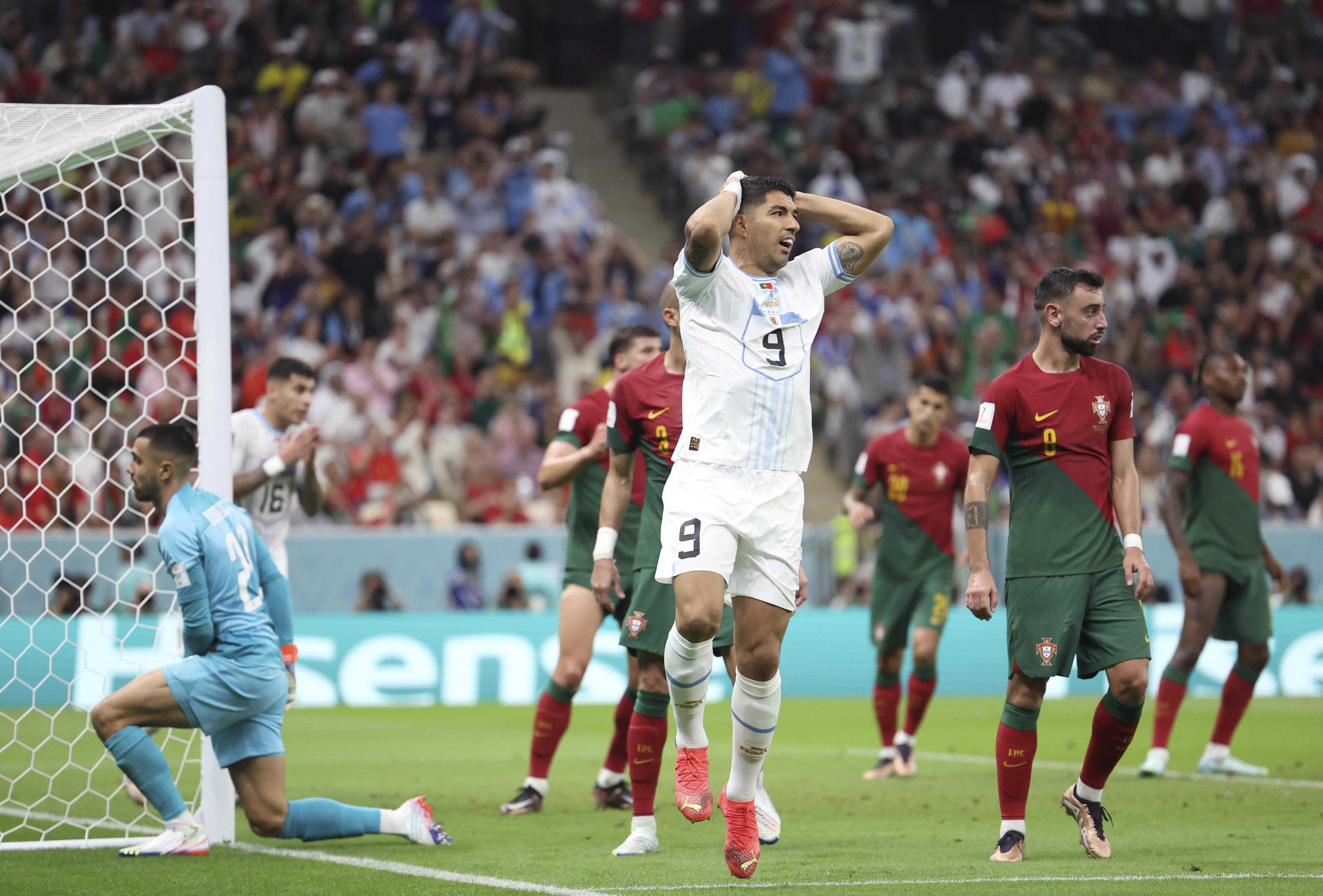 乌拉圭老将苏亚雷斯(中)错过破门良机。图/新华社