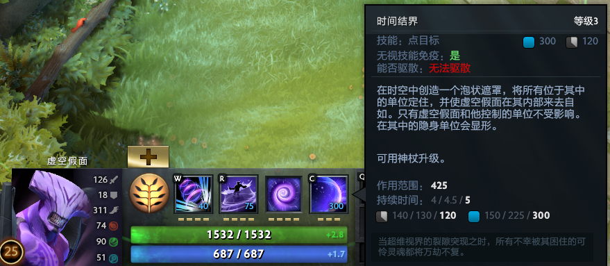当前版本下,虚空假面25级的基础蓝量是687,3级大招相比1级大招,持续时间多1秒,冷却时间少20秒,提升其实说少不少,说多又不多,比较有限,但是耗蓝量增加了150,刷2个1级大招需要300蓝,而刷2个3级大招需要600蓝,这就意味着在没有队友给秘法以及自己没有出撑蓝量装备(如血棘,林肯,散失,分身,甚至超大后期连假腿也不带了)的情况下,虚空假面刷新3级大招以后是没有足够的蓝量去立刻释放第2个大招的。