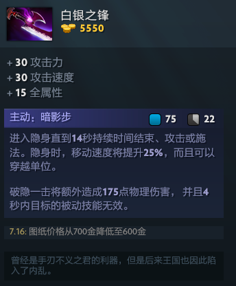 这3件基础装出完以后,根据局势看是先隐刀再BKB还是直接BKB再补隐刀。再往中后期走,随着对面永恒之盘和闪避类道具的更新,否决和金箍棒是要的。刷新球也是看局势出,最后把小电锤升级成大电锤(大电锤很好用,但是相对于否决和金箍棒的功能性作用来说,优先级没那么高,大炮、蝴蝶也是同理),隐刀升级成大隐刀。