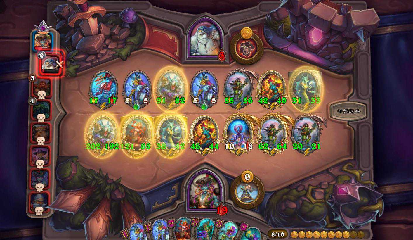 我个人的玩法是除了阵容内固定的闪鳞纳迦,如果有条件,手牌里就一定要再屯一个闪鳞纳迦。这样等到决赛时,场上和手牌的闪鳞纳迦可以提供两个圣盾,只要再找到一个凑出三连,就又可以提供一个圣盾。这样一来,场上至少有三个圣盾,且身材都不会差,决赛胜出的概率就能提高不少(如上图)。有条件的话,可以拿个火车王换命,或者拿个螳螂妖女王贴圣盾。