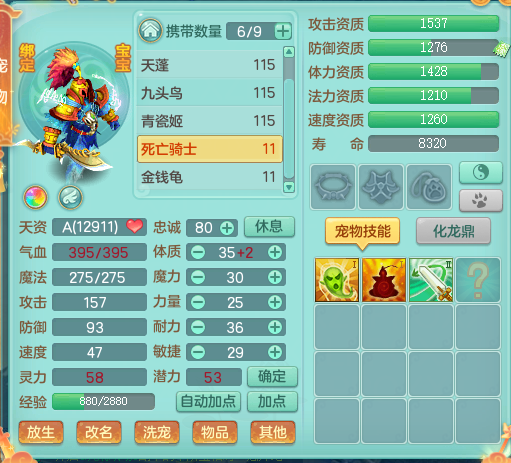 尾速宠预判九转拉骷髅天策,骷髅天策复活以后横扫四刀。有5级灵丹妙药的加成,刚背兽我这种骷髅天策只需要80品的九转拉起来就能四刀。