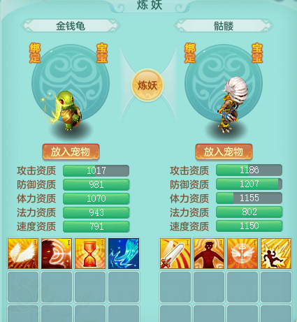 炼妖胚子选择:骷髅+金钱龟。某人推荐金钱龟+金钱龟的组合但是我测试半年下来一个8技能都没,还是骷髅+金钱龟出货率高。