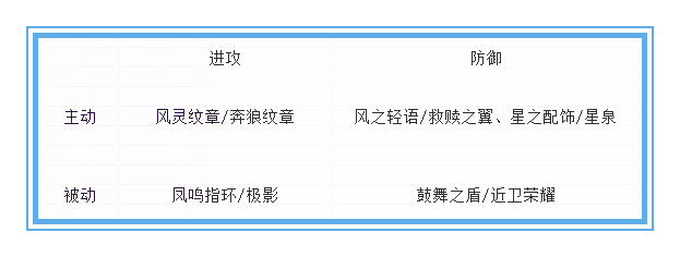 五类的辅助装备,我们可以根据主动/被动,进攻/防御来进行分类。