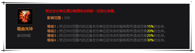 dota里面是没有辅助装备的,不过dota里面也有光环技能,只是光环技能都是英雄本身的技能。比如上图中是骷髅王的二技能——吸血光环。吸血光环可以让在骷髅王周围900码的近身友军单位在攻击的时候都获得吸血的效果。