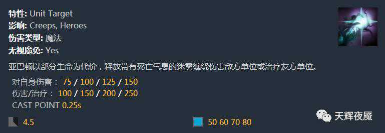 一个毫不利己专门利人的耗蓝又耗血的回复/伤害技能。优点是CD只有4.5秒,非常短,能瞬间回复可观的血量,施法距离800,比较远;缺点是前期性价比不是很高,不建议主升。需要注意的是:
