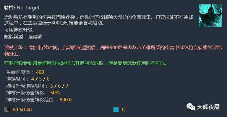 非常非常imba的技能,开启之后会驱散负面效果,同时能够吸收伤害转化为生命值,生命值低于400点的时候可以自动启动。需要注意的是: