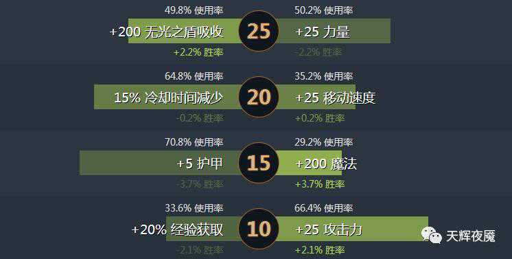 尤其是15级的天赋,70%多的人选择了加护甲,但是这个选择却降低了3.7%的胜率。亚巴顿初始护甲低,敏捷成长低,所以缺护甲是事实,但是这个短板却可以通过出装(祭品、刃甲)来弥补,所以相对来说,蓝量还是更为重要,多200的蓝,团战就可以多放出一套技能,很关键。
