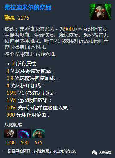 祭品的作用不言而喻,它的回蓝、护甲、吸血、回复效果都是亚巴顿所需的,有了它之后,亚巴顿基本就不用回家了,同时它合成相对平滑,对辅助而言难度不大。