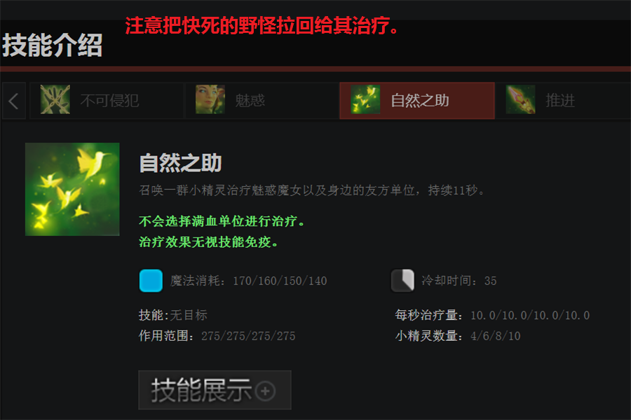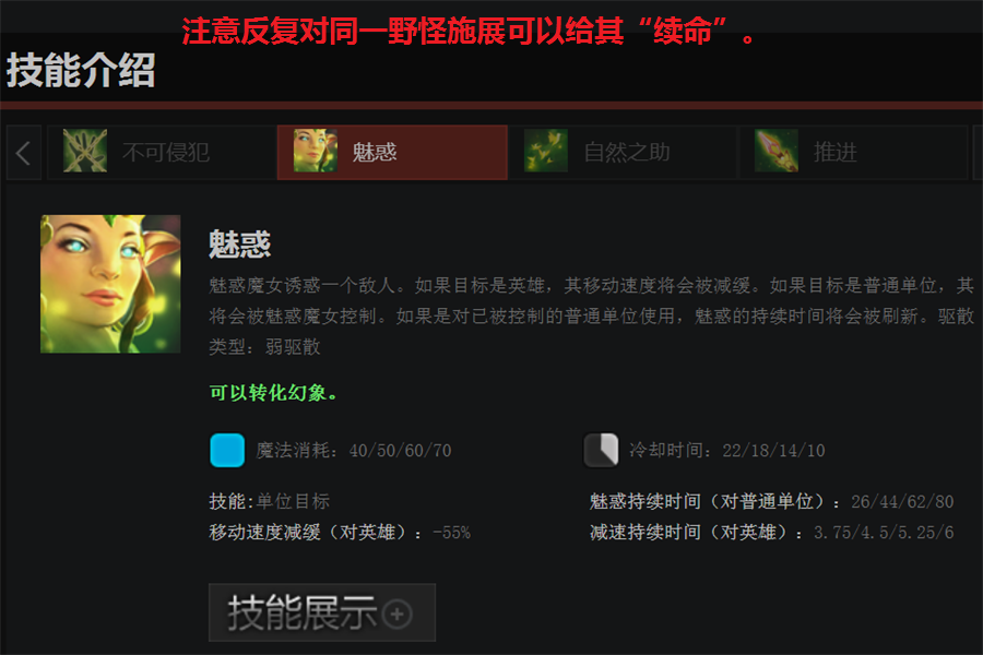 另外要记得对已经被魅惑的野怪使用W,可以延长其生存时间,反复魅惑已经召唤到手的远古野,让残血的远古单位随自己一起回去泡温泉,可以有效降低对野区资源的挤压,以及降低重新召唤生物的时间。