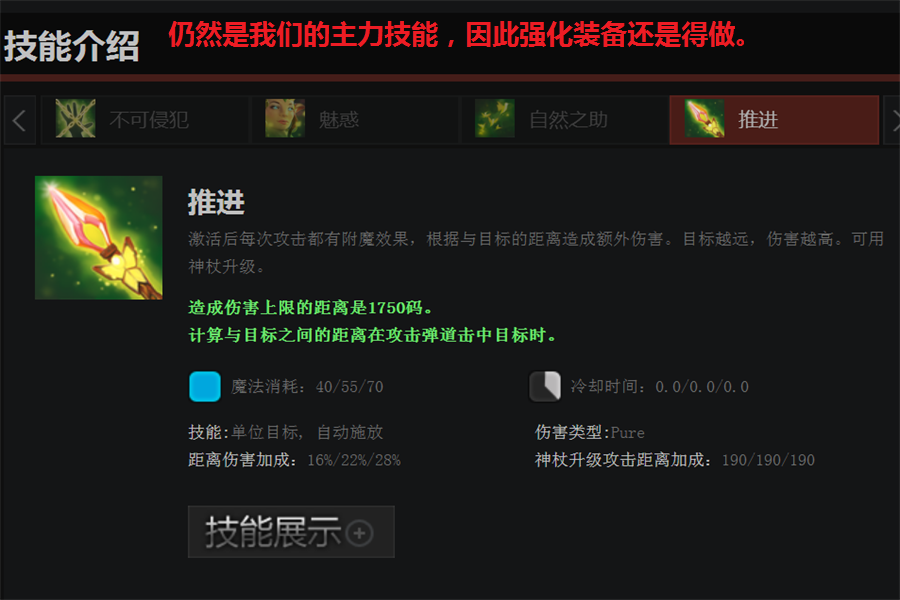对线阶段还是老样子优先出鞋子和魔龙枪,目的在于堆叠出一定的基础属性,并保证大招的伤害,之后我们要做的是阿托斯之棍,这有利于我们在点出可以魅惑远古野怪后的gank能力。