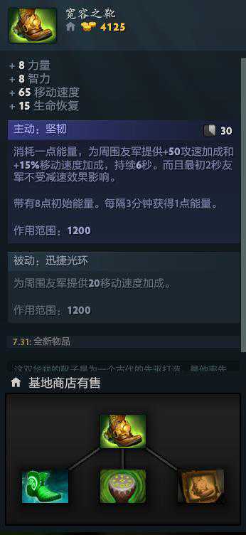 想必大家都知道,韧鼓这件道具在上个版本直接就成为了召唤系英雄专属的道具了,而在7.31新版本中这件没落已久的道具总算是得到增强了,虽然只是给它增加了升级成长的空间,但宽容之鞋的属性看上去还蛮契合三号位的,因此这件道具的出场率势必会有所提高。不过有一说一,宽容之鞋中的“宽容”这两个字就用得很到位好吧,看来官方对博大精深的中国文化也是拥有了一定理解的了(等一手原谅之帽)!