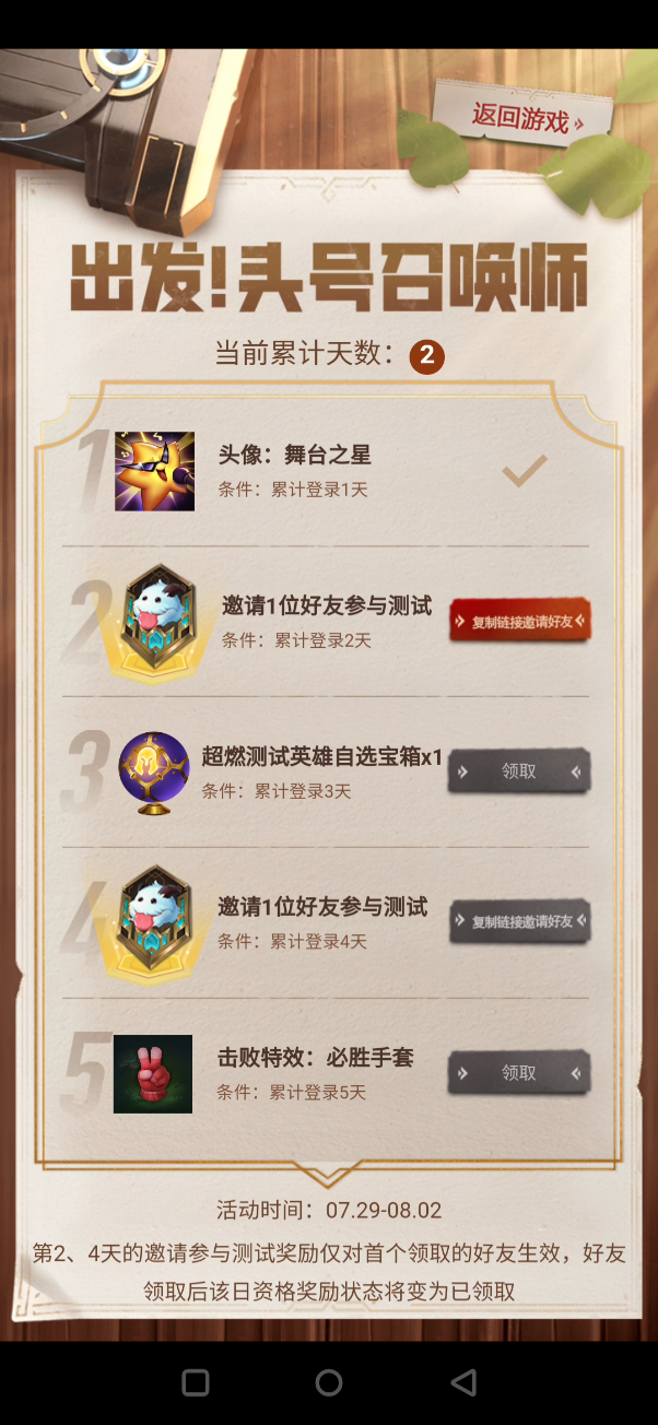 如果你现在已经有了测试资格,那么在头号召唤师这个活动中,玩家就可以通过每日签到的方式来获取两次直邀好友参与测试的机会。