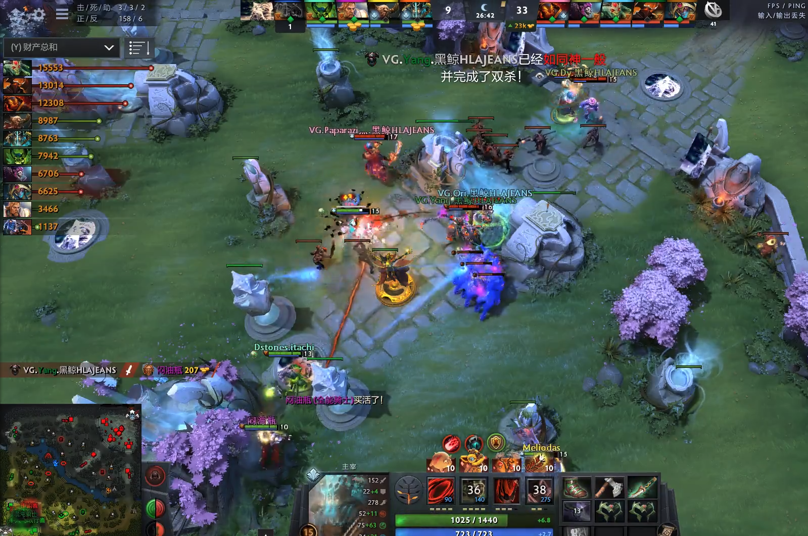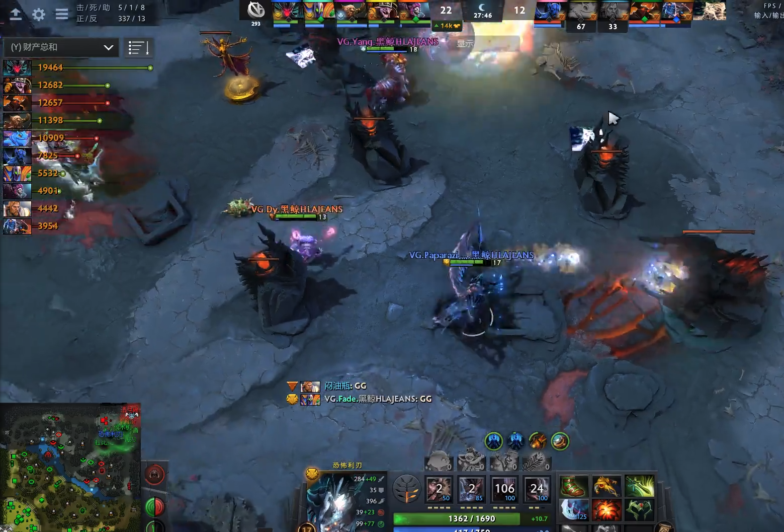 第二把VG拿出了一套不太常见的阵容,拒绝者优势路火猫,中路美杜莎,皮鞋则是三号位CK。VG的分路还算不错,下路CK只用了3分钟就把剑圣打进了野区,中路美杜莎被骨法压制了一千经济,也是7分钟拔掉中路塔,上路火猫和人马经济差不多。中期在CK和火猫的带动下,VG逐渐掌握了局势。剑圣为了增加打架能力,选择了散失出装,刷钱很慢。26分钟VG一波冲上对手高地,Room310多人买活也没能挡住,只能打出GG。