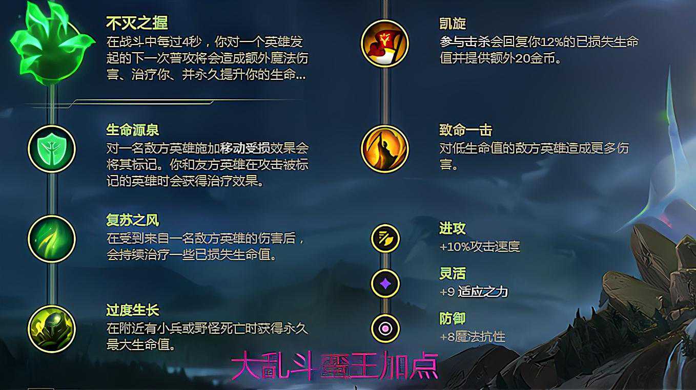 不灭之握蛮王的加点很重要,这是赢在起跑线的关键。主系天赋坚决,首选不灭之握,第二个小天赋选择生命源泉,这样能够为自己和队友提供一点治疗量,队伍如果没有ADC就换成爆破来提高拆塔的效率。之后选择复苏之风,这是一个被大多数玩家忽略了的坦克神天赋,相当于自带回复药水,点了复苏之风的坦克英雄都能变成盖伦,特别是在对抗Poke阵容时有奇效。最后点过度生长,对于蛮王来说,生命值越高,不灭之握和巨九的伤害也越高。副系选择精密系的凯旋和致命一击,碎片则点出攻速,攻击力和魔抗。