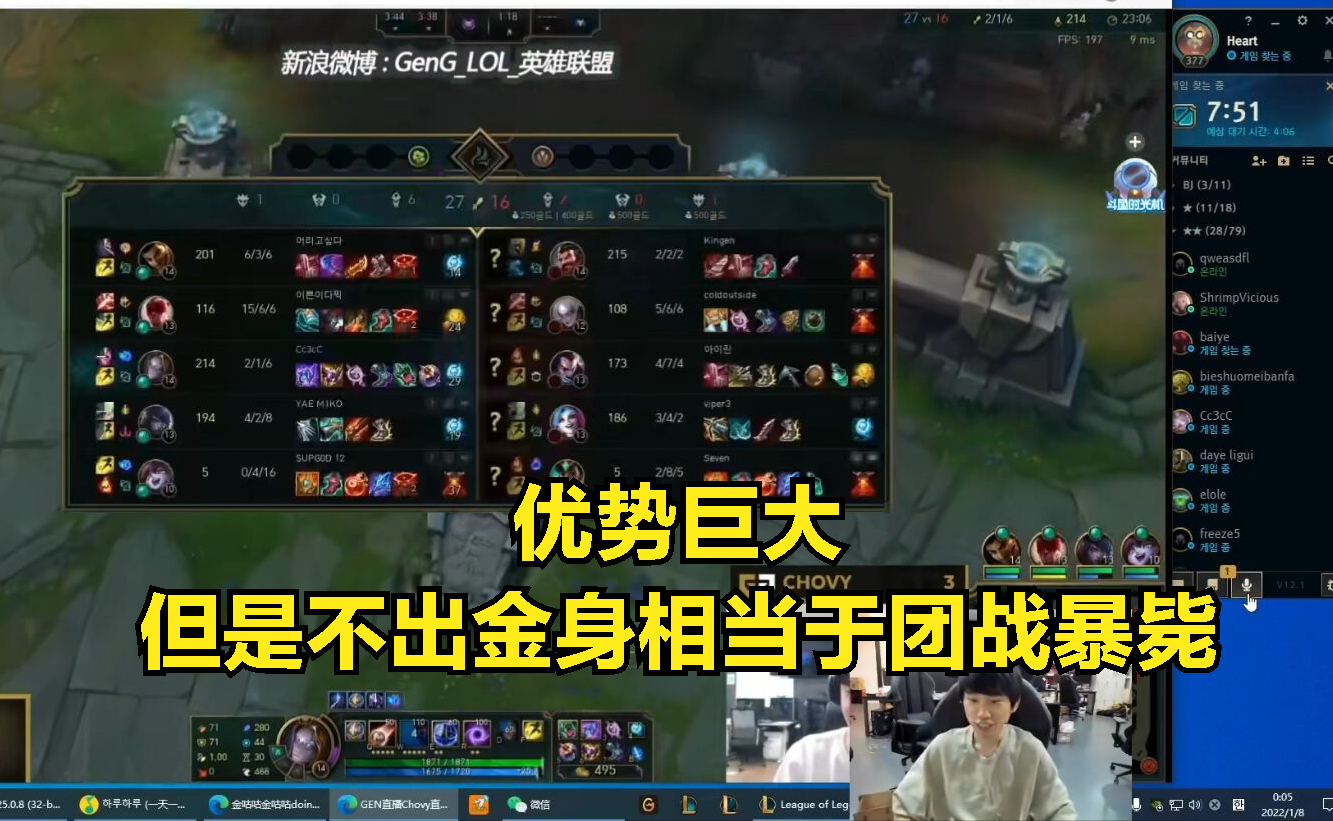 DOINB最近也是开启了韩服排位训练,而在排位等人期间,doinb也是进行了直播查房,DOINB在看到GEN战队的中单选手Chovy在直播,所以也是带着粉丝们一起去直播观看Chovy的操作,毕竟Chovy也是被很多LPL观众成为抖一中的男人。