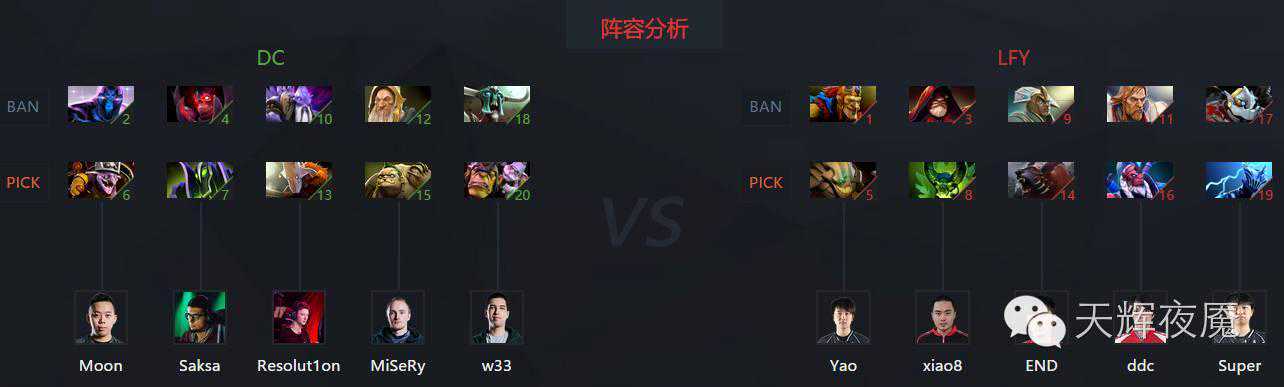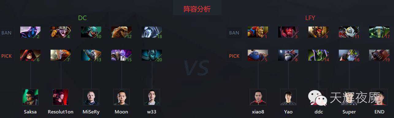 第二句LFY依然不信邪为妖精选出拍拍,包子也拿到绝活电棍,DC也拿出TI6打得很6的炼金伐木机体系。LFY前期顺风顺水,抓住优势之后破掉对面两路。但后期DC三核成型,输出爆炸,Misery的屠夫多次亮眼发挥挽救颓势,DC连续破掉LFY三路,最终LFY团战失败打出GG。