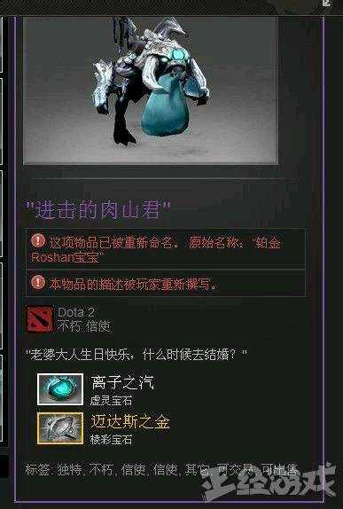 酒神在女友miko生日当天,送白金肉山,并把描述修改成“老婆大人”,白金肉山是dota2里面的一款道具,价值大概1w-6w不等左右。虽然最后证明miko是个绿茶婊,但酒神这一壮举还是被大家津津乐道。