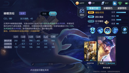 2技能:庄周梦中蝴蝶扇起翅膀,对身边的敌人造成法术伤害,并增加范围内友军3%移动速度,持续5秒,技能连续命中会叠加效果,伤害每层叠加法术伤害,移动速度每层叠加3%,最多叠加4层;被动:庄周每隔6秒会自动释放一次蝴蝶效应