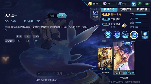 3技能:庄周幻化梦域保护附近友军,使得他们免疫控制效果并且减少10%所受到的伤害