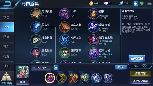 出装推荐:进化水晶+影忍之足+红莲斗篷+极寒风暴+冰痕之握+魔女斗篷(最后进化水晶换成复活甲)