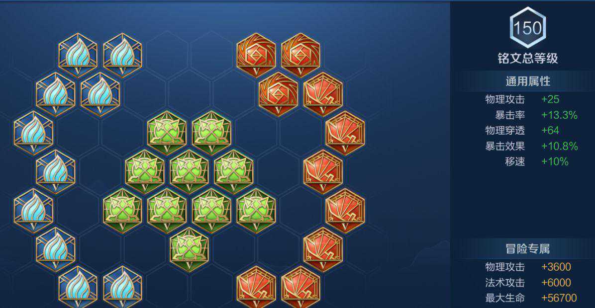 蓝色10个隐匿,绿色10个鹰眼,红色3个无双7个祸源,铭文的属性在右边面板,大家可以看下,这个是非常适合典韦的铭文属性,有着移速加成跟高额的暴击率。