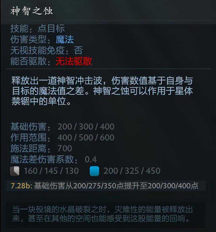 法术伤害范围型技能,本身拥有200/300/400的基础伤害,并根据与敌方英雄最大魔法值之差乘以0.4系数追加额外伤害