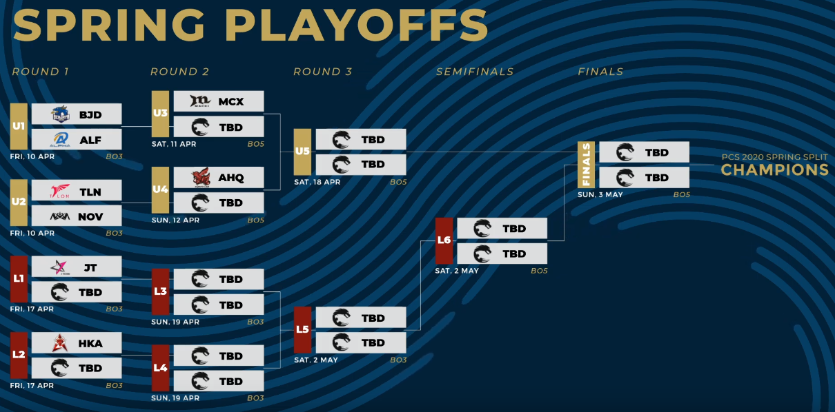 PCS季后赛赛制需要细说一番:1、2名进入胜者组第二轮,3与6、4与5分别进行胜者组第一轮的两场对局,其中3与6的胜者会碰面第2名,而4与5的胜者直面第1,(败者组第一轮的分配尚不明确,见谅)其中胜者组第一轮、败者组前三轮进行BO3,其余进行BO5。
