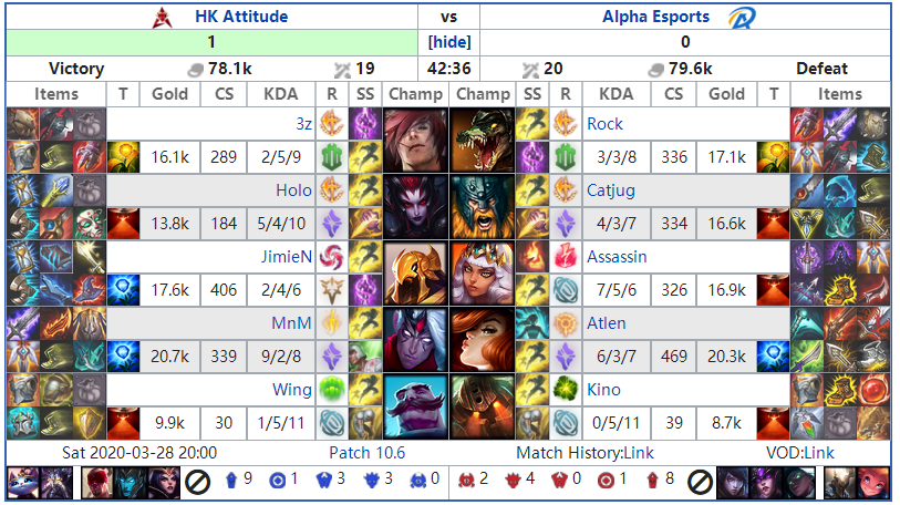 Alpha(ALF)本赛季引入了原Leg(LEG)战队的打野Catjug和中单脚神Assassin。这支战队比较神奇,可以赢一些厉害的战队,更可以输一些较弱的战队,这与打野Catjug有很大关系,当他拿到盲僧时,如同变了一个人,能把一个打野打出刺客的感觉,而有的时候,他又有一些奇思妙想:
