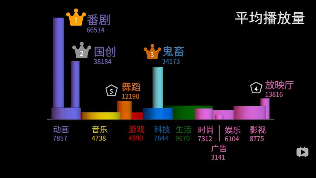 这个时候如果我们再来看一下B站的各个版区的内容播放量数据。你会发现B站的内容长尾程度是相当高的。