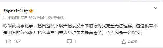 在这场风波中,还有一位dota老选手也被卷了进来,他就是海涛。海涛不仅力挺09,还指责小楼不该把聊天截图发出来攻击别人,认为这不是一个闺蜜应该做的事情。